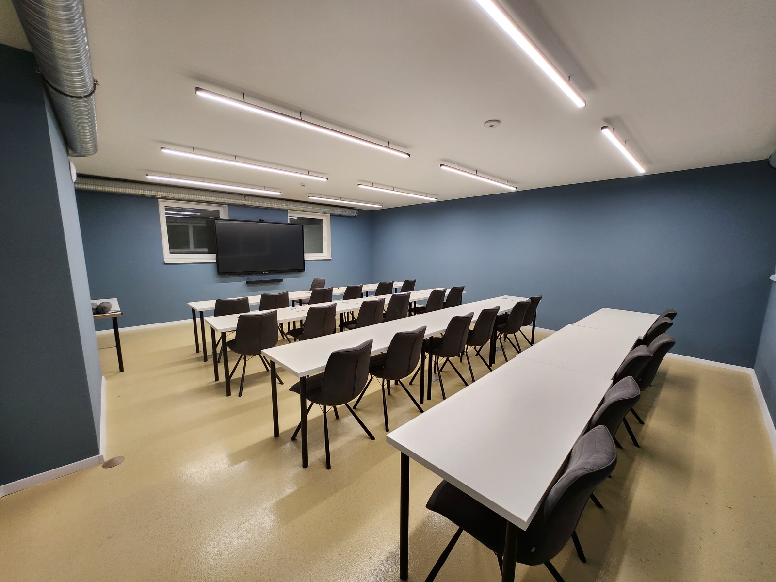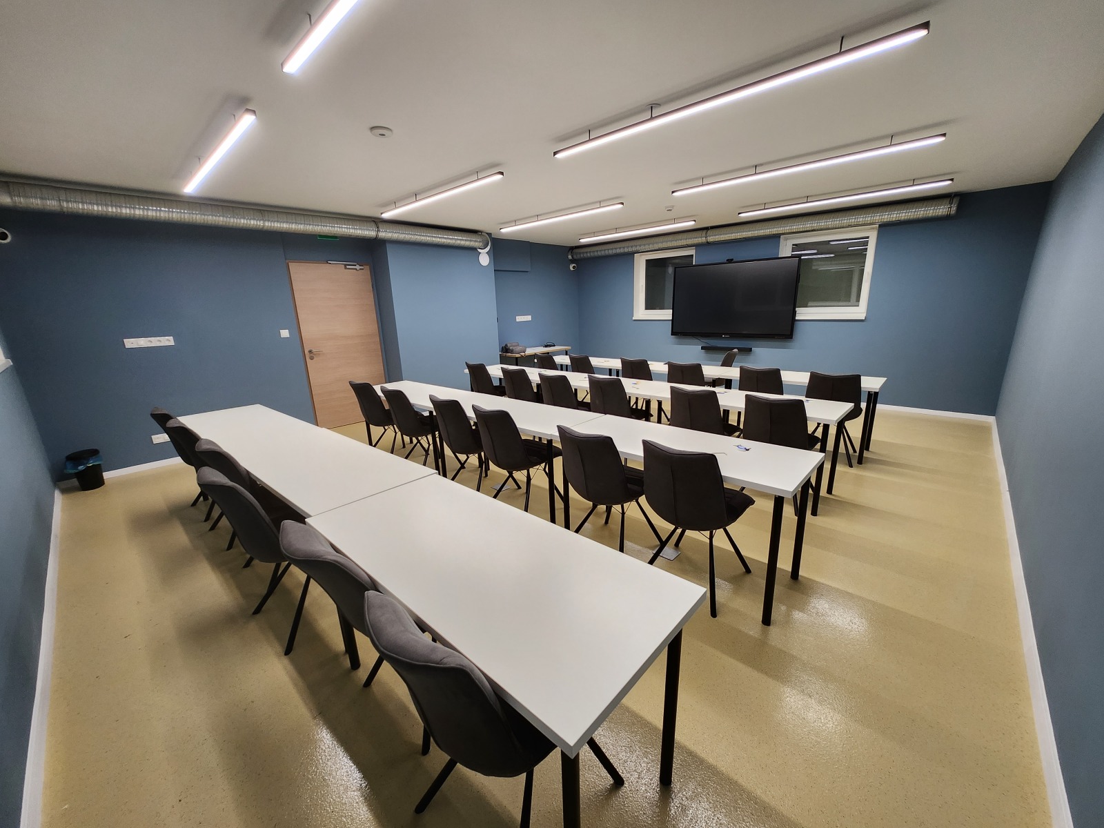 Small meeting room 50 m2 and ideal for 24 people, Smartboard, magnet board, waist supports, footrests